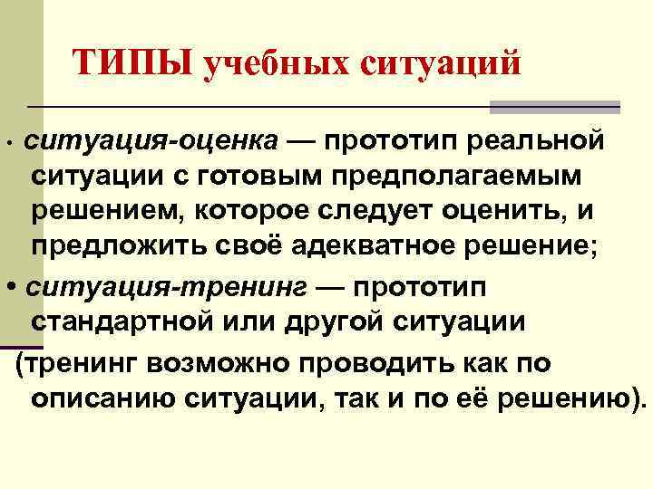 ТИПЫ учебных ситуаций • ситуация-оценка — прототип реальной ситуации с готовым предполагаемым решением, которое следует оценить, и предложить своё адекватное решение; • ситуация-тренинг — прототип стандартной или другой ситуации (тренинг возможно проводить как по описанию ситуации, так и по её решению).
