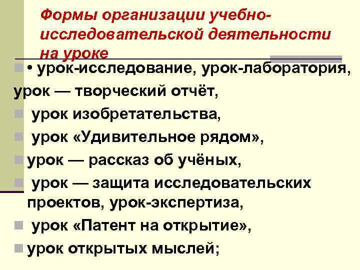 Формы организации учебноисследовательской деятельности на уроке n • урок-исследование, урок-лаборатория, урок — творческий отчёт, n урок изобретательства, n урок «Удивительное рядом» , n урок — рассказ об учёных, n урок — защита исследовательских проектов, урок-экспертиза, n урок «Патент на открытие» , n урок открытых мыслей;