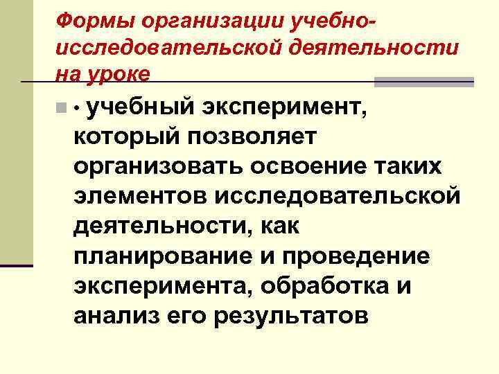 Формы организации учебноисследовательской деятельности на уроке n • учебный эксперимент, который позволяет организовать освоение таких элементов исследовательской деятельности, как планирование и проведение эксперимента, обработка и анализ его результатов