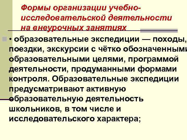 Формы организации учебноисследовательской деятельности на внеурочных занятиях n • образовательные экспедиции — походы, поездки, экскурсии с чётко обозначенными образовательными целями, программой деятельности, продуманными формами контроля. Образовательные экспедиции предусматривают активную образовательную деятельность школьников, в том числе и исследовательского характера;