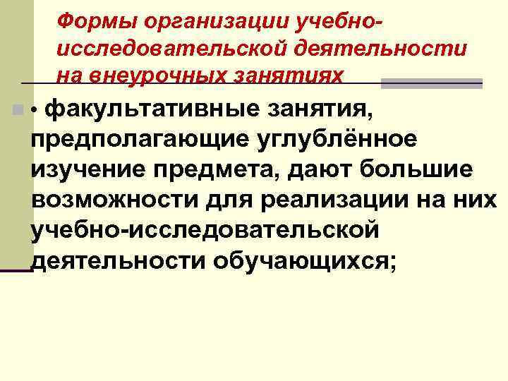 Формы организации учебноисследовательской деятельности на внеурочных занятиях n • факультативные занятия, предполагающие углублённое изучение предмета, дают большие возможности для реализации на них учебно-исследовательской деятельности обучающихся;