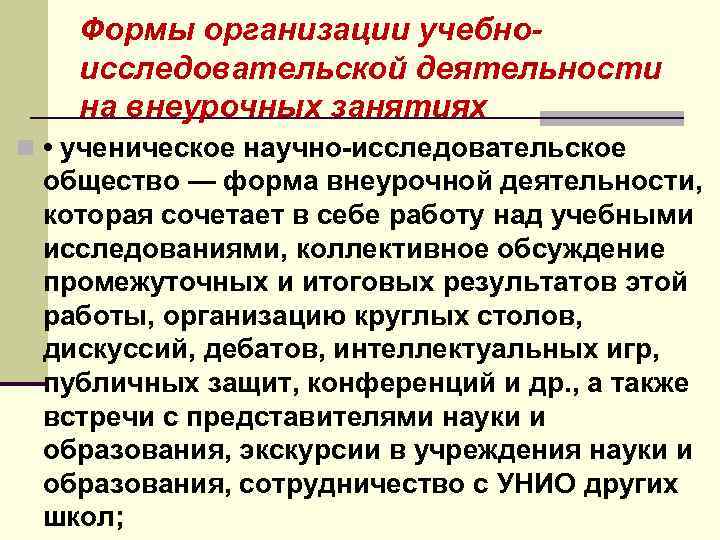 Формы организации учебноисследовательской деятельности на внеурочных занятиях n • ученическое научно-исследовательское общество — форма внеурочной деятельности, которая сочетает в себе работу над учебными исследованиями, коллективное обсуждение промежуточных и итоговых результатов этой работы, организацию круглых столов, дискуссий, дебатов, интеллектуальных игр, публичных защит, конференций и др. , а также встречи с представителями науки и образования, экскурсии в учреждения науки и образования, сотрудничество с УНИО других школ;