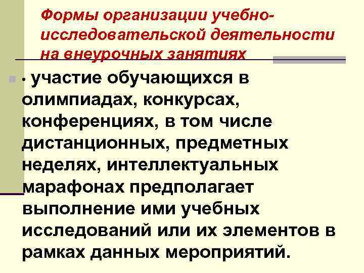 Формы организации учебноисследовательской деятельности на внеурочных занятиях участие обучающихся в олимпиадах, конкурсах, конференциях, в том числе дистанционных, предметных неделях, интеллектуальных марафонах предполагает выполнение ими учебных исследований или их элементов в рамках данных мероприятий. n •