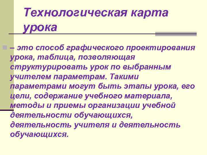 Технологическая карта урока n – это способ графического проектирования урока, таблица, позволяющая структурировать урок по выбранным учителем параметрам. Такими параметрами могут быть этапы урока, его цели, содержание учебного материала, методы и приемы организации учебной деятельности обучающихся, деятельность учителя и деятельность обучающихся.