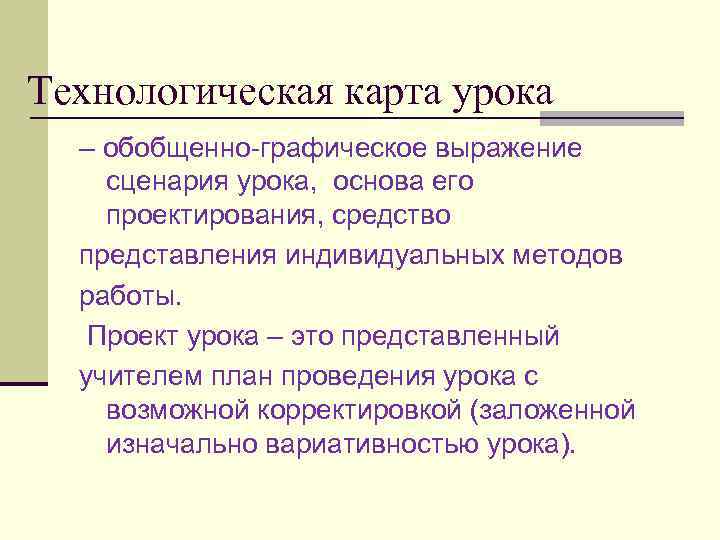 Технологическая карта урока – обобщенно графическое выражение сценария урока, основа его проектирования, средство представления индивидуальных методов работы. Проект урока – это представленный учителем план проведения урока с возможной корректировкой (заложенной изначально вариативностью урока).