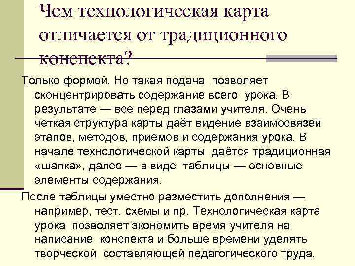 Чем технологическая карта отличается от традиционного конспекта? Только формой. Но такая подача позволяет сконцентрировать содержание всего урока. В результате — все перед глазами учителя. Очень четкая структура карты даёт видение взаимосвязей этапов, методов, приемов и содержания урока. В начале технологической карты даётся традиционная «шапка» , далее — в виде таблицы — основные элементы содержания. После таблицы уместно разместить дополнения — например, тест, схемы и пр. Технологическая карта урока позволяет экономить время учителя на написание конспекта и больше времени уделять творческой составляющей педагогического труда.
