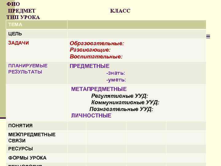 ФИО ПРЕДМЕТ ТИП УРОКА КЛАСС ТЕМА ЦЕЛЬ ЗАДАЧИ n Образовательные: Развивающие: му, конкурентно напряженному социуму. Воспитательные: ПЛАНИРУЕМЫЕ РЕЗУЛЬТАТЫ ПРЕДМЕТНЫЕ -знать: -уметь: МЕТАПРЕДМЕТНЫЕ Регулятивные УУД: Коммуникативные УУД: Познавательные УУД: ЛИЧНОСТНЫЕ ПОНЯТИЯ МЕЖПРЕДМЕТНЫЕ СВЯЗИ РЕСУРСЫ ФОРМЫ УРОКА