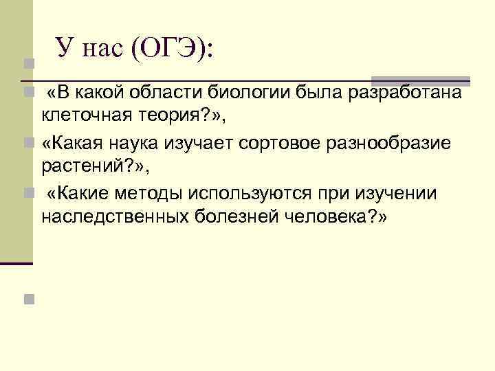 У нас (ОГЭ): n n «В какой области биологии была разработана клеточная теория? » , n «Какая наука изучает сортовое разнообразие растений? » , n «Какие методы используются при изучении наследственных болезней человека? » n