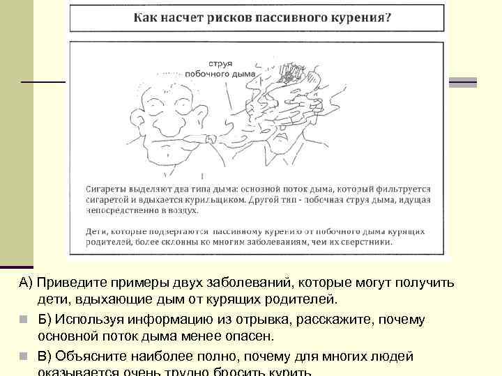 А) Приведите примеры двух заболеваний, которые могут получить дети, вдыхающие дым от курящих родителей. n Б) Используя информацию из отрывка, расскажите, почему основной поток дыма менее опасен. n В) Объясните наиболее полно, почему для многих людей