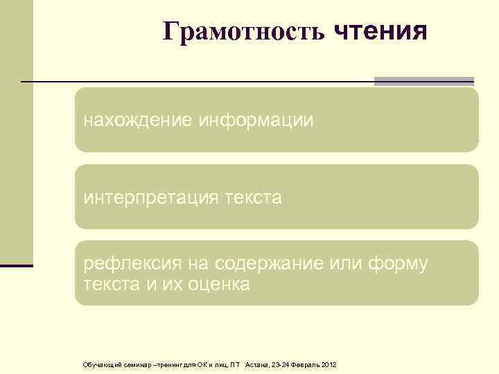 Грамотность чтения нахождение информации интерпретация текста рефлексия на содержание или форму текста и их оценка Обучающий семинар –тренинг для ОК и лиц, ПТ Астана, 23 24 Февраль 2012