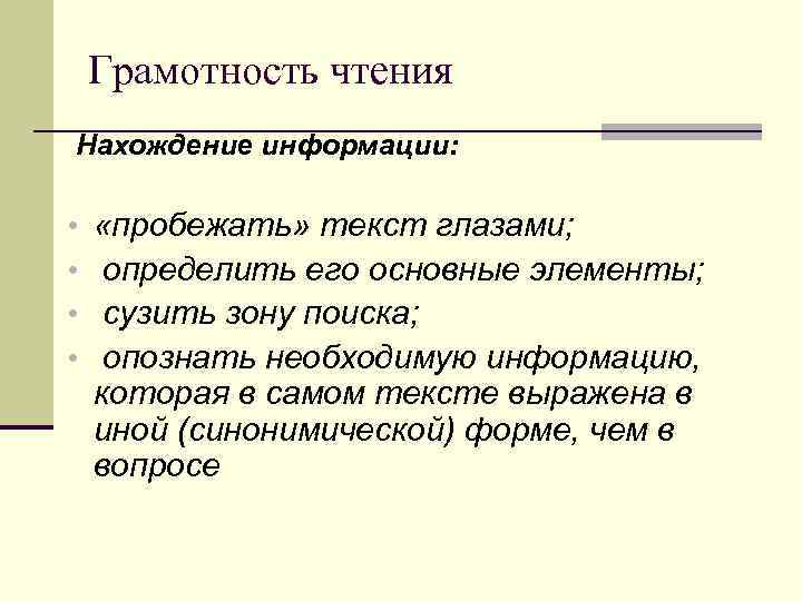 Грамотность чтения Нахождение информации: • • «пробежать» текст глазами; определить его основные элементы; сузить зону поиска; опознать необходимую информацию, которая в самом тексте выражена в иной (синонимической) форме, чем в вопросе