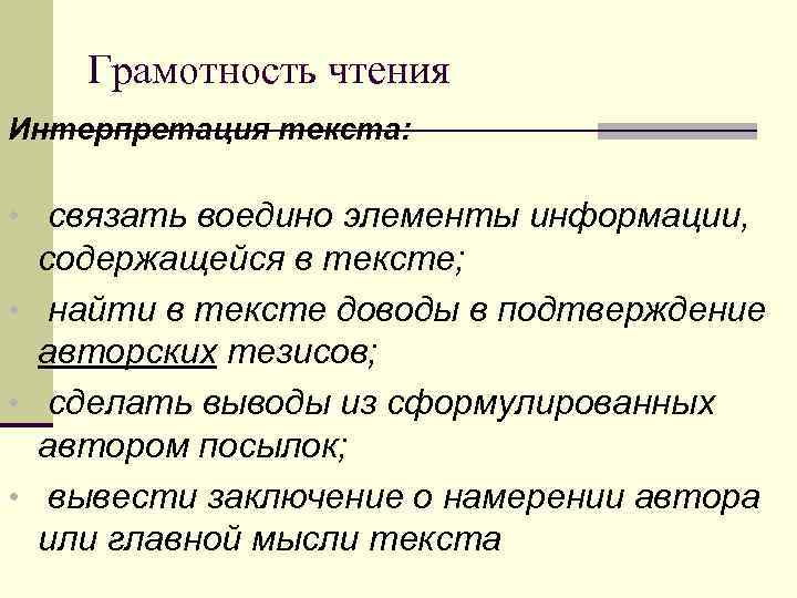 Грамотность чтения Интерпретация текста: • связать воедино элементы информации, содержащейся в тексте; • найти в тексте доводы в подтверждение авторских тезисов; • сделать выводы из сформулированных автором посылок; • вывести заключение о намерении автора или главной мысли текста