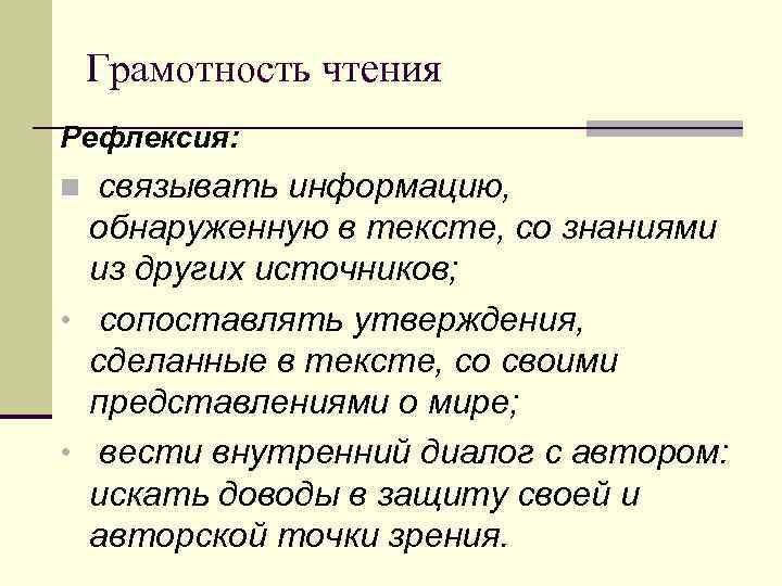Грамотность чтения Рефлексия: n связывать информацию, обнаруженную в тексте, со знаниями из других источников; • сопоставлять утверждения, сделанные в тексте, со своими представлениями о мире; • вести внутренний диалог с автором: искать доводы в защиту своей и авторской точки зрения.
