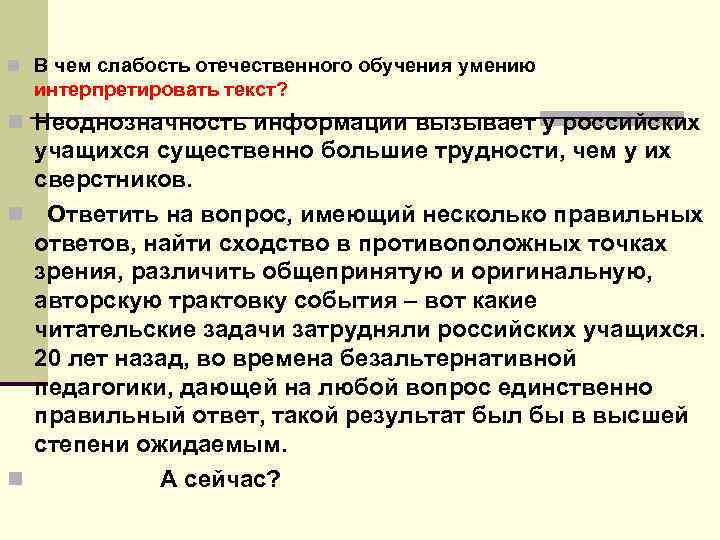 n В чем слабость отечественного обучения умению интерпретировать текст? n Неоднозначность информации вызывает у российских учащихся существенно большие трудности, чем у их сверстников. n Ответить на вопрос, имеющий несколько правильных ответов, найти сходство в противоположных точках зрения, различить общепринятую и оригинальную, авторскую трактовку события – вот какие читательские задачи затрудняли российских учащихся. 20 лет назад, во времена безальтернативной педагогики, дающей на любой вопрос единственно правильный ответ, такой результат был бы в высшей степени ожидаемым. n А сейчас?