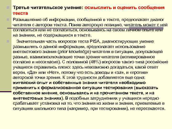 n Третье читательское умение: осмыслить и оценить сообщения текста n Размышление об информации, сообщенной в тексте, предполагает диалог читателя с автором текста. Поняв авторскую позицию, читатель может с ней согласиться или не согласиться, основываясь на своем личном опыте или на знаниях, не содержащихся в тексте. n Значительная часть вопросов теста PISA, диагностирующих умение размышлять о данной информации, предполагает использование внетекстового знания (prior knowledge) читателя в ситуации, допускающей разные, взаимоисключающие точки зрения читателя (мотивированное согласие и несогласие). С половиной (48%) вопросов такого типа российские учащиеся справились плохо: здесь невозможно догадаться, какой ответ верен, «Да» или «Нет» , потому что есть доводы и «за» , и «против» авторской точки зрения. К этой трудности добавляется еще одна: житейский опыт и собственные знания читателя необходимо применить к формализованной ситуации тестирования (высказать собственное мнение, основываясь и на прочитанном тексте, и на внетекстовых знаниях). В подобных затруднениях у учащихся нередко срабатывает установка на то, что знания из жизни и знания, приемлемые в ситуациях школьного типа (например, при тестировании), не пересекаются.