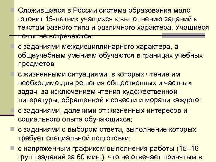 n Сложившаяся в России система образования мало n n n готовит 15 летних учащихся к выполнению заданий к текстам разного типа и различного характера. Учащиеся почти не встречаются: с заданиями междисциплинарного характера, а общеучебным умениям обучаются в границах учебных предметов; с жизненными ситуациями, в которых чтение им необходимо для решения общественных и частных задач, за исключением чтения художественной литературы, обращенной к совести и морали каждого; с заданиями, далекими от жизненных интересов и социального опыта обучающихся; с заданиями с выбором ответа, выполнение которых требует специальной подготовки; с напряженным графиком выполнения работы (15– 16 групп заданий за 60 мин. ), что не отвечает принятым в