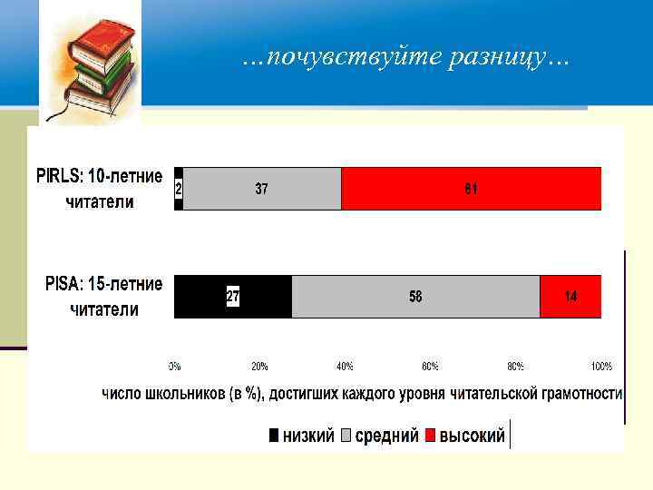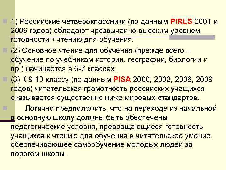 n 1) Российские четвероклассники (по данным PIRLS 2001 и 2006 годов) обладают чрезвычайно высоким уровнем готовности к чтению для обучения. n (2) Основное чтение для обучения (прежде всего – обучение по учебникам истории, географии, биологии и пр. ) начинается в 5 7 классах. n (3) К 9 10 классу (по данным PISA 2000, 2003, 2006, 2009 годов) читательская грамотность российских учащихся оказывается существенно ниже мировых стандартов. n Логично предположить, что на переходе из начальной в основную школу должны быть обеспечены педагогические условия, превращающиеся готовность учащихся к чтению для обучения в читательское умение, обеспечивающее самообучение молодых людей за порогом школы.