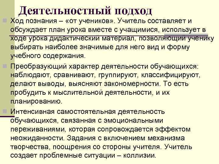 Деятельностный подход n Ход познания – «от учеников» . Учитель составляет и обсуждает план урока вместе с учащимися, использует в ходе урока дидактический материал, позволяющий ученику выбирать наиболее значимые для него вид и форму учебного содержания. n Преобразующий характер деятельности обучающихся: наблюдают, сравнивают, группируют, классифицируют, делают выводы, выясняют закономерности. То есть пробудить к мыслительной деятельности, и их планированию. n Интенсивная самостоятельная деятельность обучающихся, связанная с эмоциональными переживаниями, которая сопровождается эффектом неожиданности. Задания с включением механизма творчества, поощрения со стороны учителя. Учитель создает проблемные ситуации – коллизии.