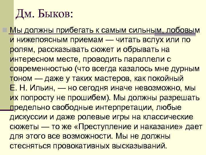 Дм. Быков: n Мы должны прибегать к самым сильным, лобовым и нижепоясным приемам — читать вслух или по ролям, рассказывать сюжет и обрывать на интересном месте, проводить параллели с современностью (что всегда казалось мне дурным тоном — даже у таких мастеров, как покойный Е. Н. Ильин, — но сегодня иначе невозможно, мы их попросту не прошибем). Мы должны разрешать предельно свободные интерпретации, любые дискуссии и даже ролевые игры на классические сюжеты — то же «Преступление и наказание» дает для этого все возможности. Мы не должны стесняться провокативных высказываний.