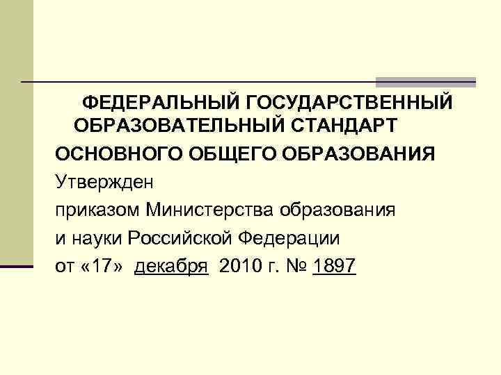 ФЕДЕРАЛЬНЫЙ ГОСУДАРСТВЕННЫЙ ОБРАЗОВАТЕЛЬНЫЙ СТАНДАРТ ОСНОВНОГО ОБЩЕГО ОБРАЗОВАНИЯ Утвержден приказом Министерства образования и науки Российской Федерации от « 17» декабря 2010 г. № 1897