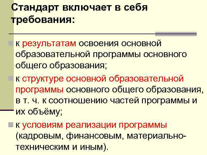 Стандарт включает в себя требования: n к результатам освоения основной образовательной программы основного общего образования; n к структуре основной образовательной программы основного общего образования, в т. ч. к соотношению частей программы и их объёму; n к условиям реализации программы (кадровым, финансовым, материально техническим и иным).