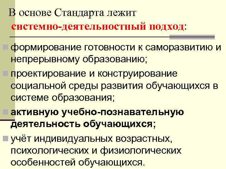 В основе Стандарта лежит системно-деятельностный подход: n формирование готовности к саморазвитию и непрерывному образованию; n проектирование и конструирование социальной среды развития обучающихся в системе образования; n активную учебно-познавательную деятельность обучающихся; n учёт индивидуальных возрастных, психологических и физиологических особенностей обучающихся.