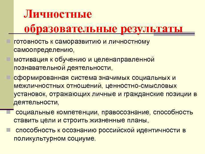 Личностные образовательные результаты n готовность к саморазвитию и личностному n n самоопределению, мотивация к обучению и целенаправленной познавательной деятельности, сформированная система значимых социальных и межличностных отношений, ценностно смысловых установок, отражающих личные и гражданские позиции в деятельности, социальные компетенции, правосознание, способность ставить цели и строить жизненные планы, способность к осознанию российской идентичности в поликультурном социуме.
