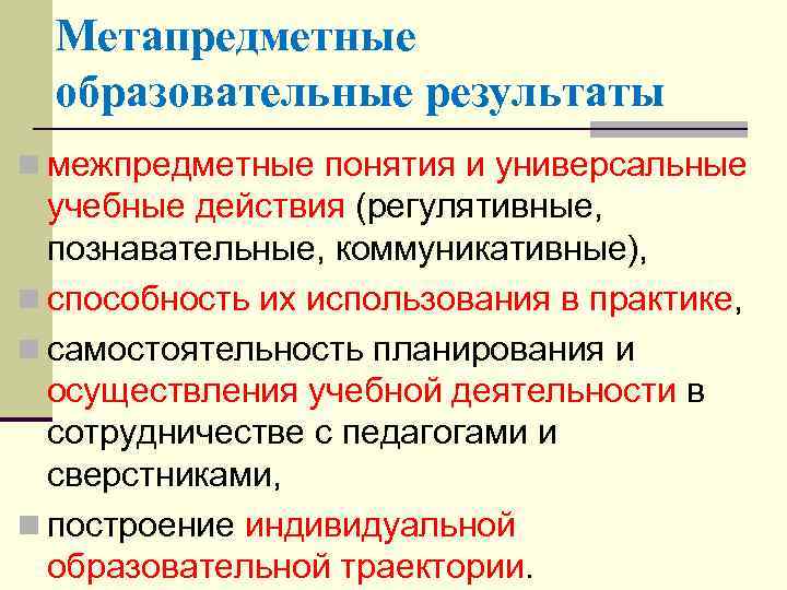 Метапредметные образовательные результаты n межпредметные понятия и универсальные учебные действия (регулятивные, познавательные, коммуникативные), n способность их использования в практике, n самостоятельность планирования и осуществления учебной деятельности в сотрудничестве с педагогами и сверстниками, n построение индивидуальной образовательной траектории.