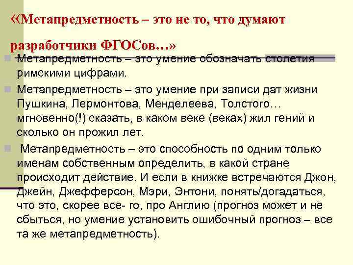 «Метапредметность – это не то, что думают разработчики ФГОСов…» n Метапредметность – это умение обозначать столетия римскими цифрами. n Метапредметность – это умение при записи дат жизни Пушкина, Лермонтова, Менделеева, Толстого… мгновенно(!) сказать, в каком веке (веках) жил гений и сколько он прожил лет. n Метапредметность – это способность по одним только именам собственным определить, в какой стране происходит действие. И если в книжке встречаются Джон, Джейн, Джефферсон, Мэри, Энтони, понять/догадаться, что это, скорее все го, про Англию (прогноз может и не сбыться, но умение установить ошибочный прогноз – все та же метапредметность).