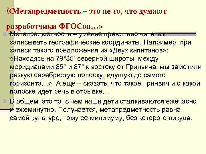 «Метапредметность – это не то, что думают разработчики ФГОСов…» n Метапредметность – умение правильно читать и записывать географические координаты. Например, при записи такого предложения из «Двух капитанов» : «Находясь на 79° 35’ северной широты, между меридианами 86° и 87° к востоку от Гринвича, мы заметили резкую серебристую полоску, идущую до самого горизонта…» . А еще – сказать, что такое Гринвич и о какой полоске идет речь в отрывке… n В общем, это то, с чем наши дети сталкиваются ежечасно и ежеминутно. Получается, метапредметность равна самой культуре, тому ее минимуму, без которого никуда.