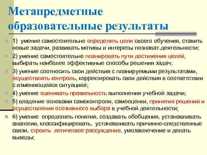 Метапредметные образовательные результаты n 1) умение самостоятельно определять цели своего обучения, ставить n n n новые задачи, развивать мотивы и интересы познават. деятельности; 2) умение самостоятельно планировать пути достижения целей, выбирать наиболее эффективные способы решения задач; 3) умение соотносить свои действия с планируемыми результатами, осуществлять контроль, корректировать свои действия в соответствии с изменяющейся ситуацией; 4) умение оценивать правильность выполнения учебной задачи; 5) владение основами самоконтроля, самооценки, принятия решений и осуществления осознанного выбора в учебной деятельности; 6) умение определять понятия, создавать обобщения, устанавливать аналогии, классифицировать, устанавливать причинно следственные связи, строить логическое рассуждение, умозаключение и делать выводы;