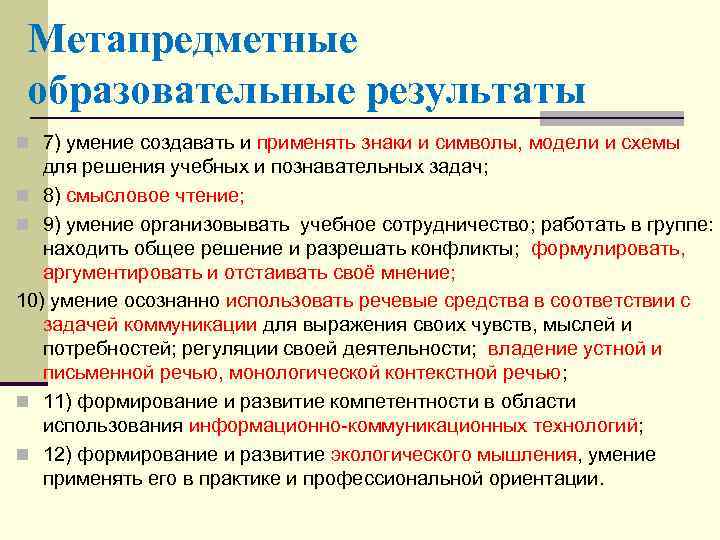 Метапредметные образовательные результаты n 7) умение создавать и применять знаки и символы, модели и схемы для решения учебных и познавательных задач; n 8) смысловое чтение; n 9) умение организовывать учебное сотрудничество; работать в группе: находить общее решение и разрешать конфликты; формулировать, аргументировать и отстаивать своё мнение; 10) умение осознанно использовать речевые средства в соответствии с задачей коммуникации для выражения своих чувств, мыслей и потребностей; регуляции своей деятельности; владение устной и письменной речью, монологической контекстной речью; n 11) формирование и развитие компетентности в области использования информационно коммуникационных технологий; n 12) формирование и развитие экологического мышления, умение применять его в практике и профессиональной ориентации.