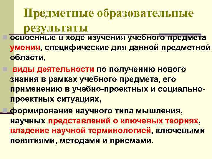 Предметные образовательные результаты n освоенные в ходе изучения учебного предмета умения, специфические для данной предметной области, n виды деятельности по получению нового знания в рамках учебного предмета, его применению в учебно-проектных и социальнопроектных ситуациях, n формирование научного типа мышления, научных представлений о ключевых теориях, владение научной терминологией, ключевыми понятиями, методами и приемами.
