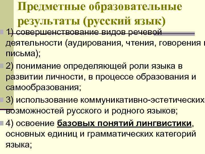 Предметные образовательные результаты (русский язык) n 1) совершенствование видов речевой деятельности (аудирования, чтения, говорения и письма); n 2) понимание определяющей роли языка в развитии личности, в процессе образования и самообразования; n 3) использование коммуникативно эстетических возможностей русского и родного языков; n 4) освоение базовых понятий лингвистики, основных единиц и грамматических категорий языка;