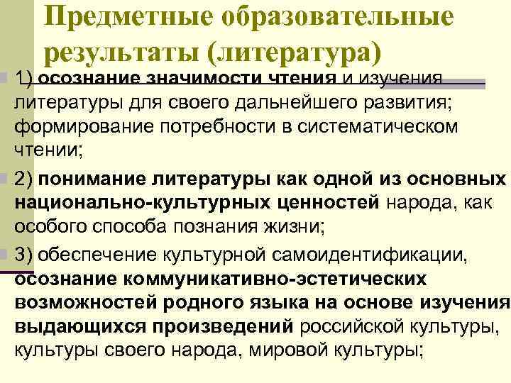 Предметные образовательные результаты (литература) n 1) осознание значимости чтения и изучения литературы для своего дальнейшего развития; формирование потребности в систематическом чтении; n 2) понимание литературы как одной из основных национально-культурных ценностей народа, как особого способа познания жизни; n 3) обеспечение культурной самоидентификации, осознание коммуникативно-эстетических возможностей родного языка на основе изучения выдающихся произведений российской культуры, культуры своего народа, мировой культуры;