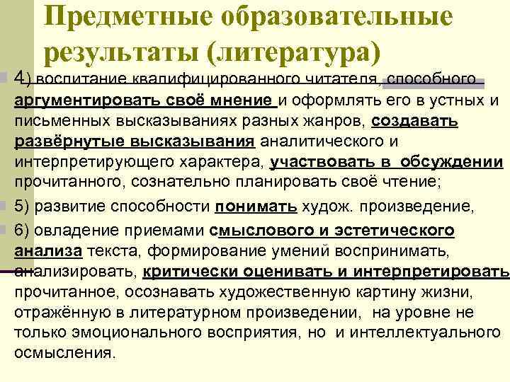Предметные образовательные результаты (литература) n 4) воспитание квалифицированного читателя, способного аргументировать своё мнение и оформлять его в устных и письменных высказываниях разных жанров, создавать развёрнутые высказывания аналитического и интерпретирующего характера, участвовать в обсуждении прочитанного, сознательно планировать своё чтение; n 5) развитие способности понимать худож. произведение, n 6) овладение приемами смыслового и эстетического анализа текста, формирование умений воспринимать, анализировать, критически оценивать и интерпретировать прочитанное, осознавать художественную картину жизни, отражённую в литературном произведении, на уровне не только эмоционального восприятия, но и интеллектуального осмысления.