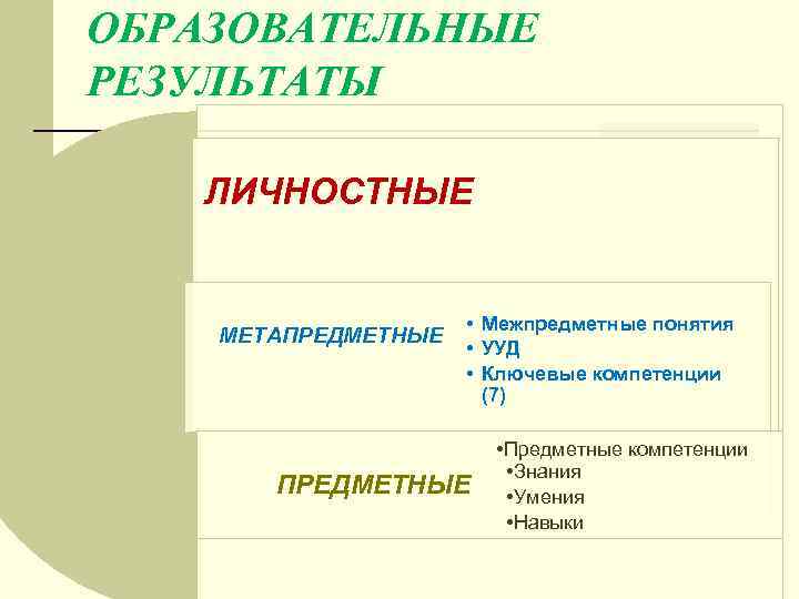 ОБРАЗОВАТЕЛЬНЫЕ РЕЗУЛЬТАТЫ ЛИЧНОСТНЫЕ МЕТАПРЕДМЕТНЫЕ • Межпредметные понятия • УУД • Ключевые компетенции (7) ПРЕДМЕТНЫЕ • Предметные компетенции • Знания • Умения • Навыки