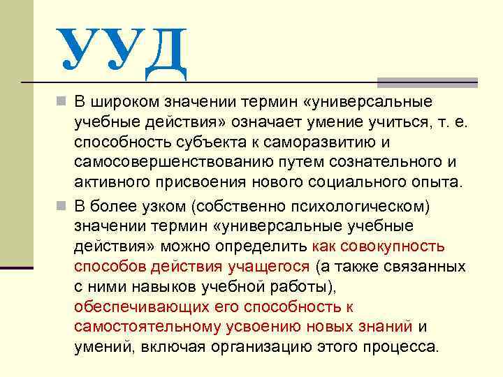 УУД n В широком значении термин «универсальные учебные действия» означает умение учиться, т. е. способность субъекта к саморазвитию и самосовершенствованию путем сознательного и активного присвоения нового социального опыта. n В более узком (собственно психологическом) значении термин «универсальные учебные действия» можно определить как совокупность способов действия учащегося (а также связанных с ними навыков учебной работы), обеспечивающих его способность к самостоятельному усвоению новых знаний и умений, включая организацию этого процесса.