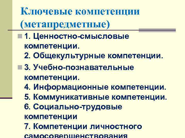 Ключевые компетенции (метапредметные) n 1. Ценностно-смысловые компетенции. 2. Общекультурные компетенции. n 3. Учебно-познавательные компетенции. 4. Информационные компетенции. 5. Коммуникативные компетенции. 6. Социально-трудовые компетенции 7. Компетенции личностного