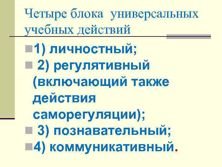 Четыре блока универсальных учебных действий n 1) личностный; n 2) регулятивный (включающий также действия саморегуляции); n 3) познавательный; n 4) коммуникативный.