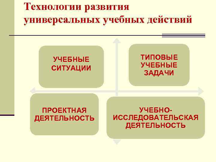 Технологии развития универсальных учебных действий УЧЕБНЫЕ СИТУАЦИИ ПРОЕКТНАЯ ДЕЯТЕЛЬНОСТЬ ТИПОВЫЕ УЧЕБНЫЕ ЗАДАЧИ УЧЕБНОИССЛЕДОВАТЕЛЬСКАЯ ДЕЯТЕЛЬНОСТЬ
