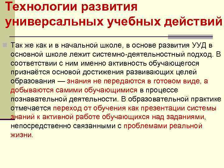 Технологии развития универсальных учебных действий n Так же как и в начальной школе, в основе развития УУД в основной школе лежит системно деятельностный подход. В соответствии с ним именно активность обучающегося признаётся основой достижения развивающих целей образования — знания не передаются в готовом виде, а добываются самими обучающимися в процессе познавательной деятельности. В образовательной практике отмечается переход от обучения как презентации системы знаний к активной работе обучающихся над заданиями, непосредственно связанными с проблемами реальной жизни.