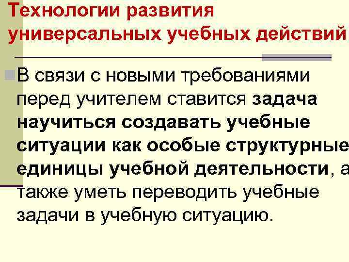 Технологии развития универсальных учебных действий n. В связи с новыми требованиями перед учителем ставится задача научиться создавать учебные ситуации как особые структурные единицы учебной деятельности, а также уметь переводить учебные задачи в учебную ситуацию.