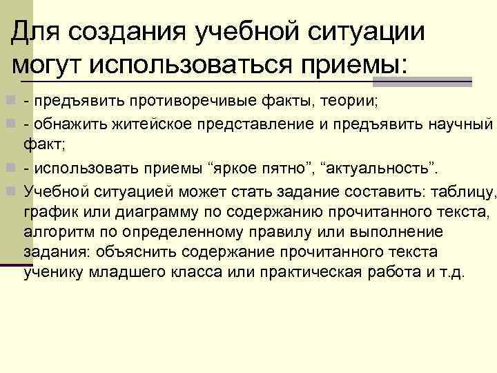 Для создания учебной ситуации могут использоваться приемы: n предъявить противоречивые факты, теории; n обнажить житейское представление и предъявить научный факт; n использовать приемы “яркое пятно”, “актуальность”. n Учебной ситуацией может стать задание составить: таблицу, график или диаграмму по содержанию прочитанного текста, алгоритм по определенному правилу или выполнение задания: объяснить содержание прочитанного текста ученику младшего класса или практическая работа и т. д.