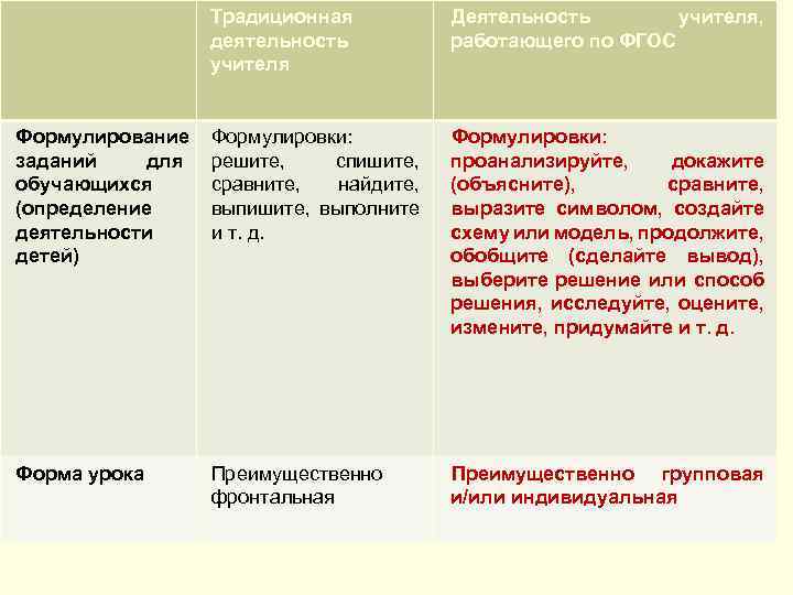 Традиционная деятельность учителя Деятельность учителя, работающего по ФГОС Формулирование заданий для обучающихся (определение деятельности детей) Формулировки: решите, спишите, сравните, найдите, выпишите, выполните и т. д. Формулировки: проанализируйте, докажите (объясните), сравните, выразите символом, создайте схему или модель, продолжите, обобщите (сделайте вывод), выберите решение или способ решения, исследуйте, оцените, измените, придумайте и т. д. Форма урока Преимущественно фронтальная Преимущественно групповая и/или индивидуальная
