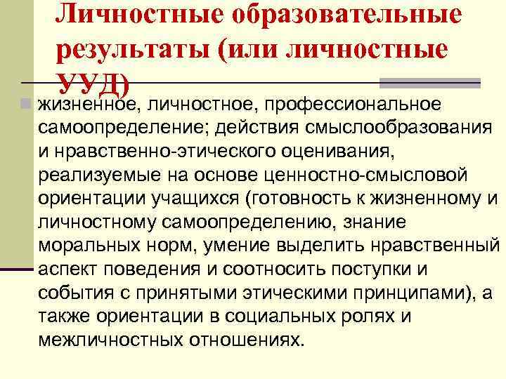 Личностные образовательные результаты (или личностные УУД) n жизненное, личностное, профессиональное самоопределение; действия смыслообразования и нравственно этического оценивания, реализуемые на основе ценностно смысловой ориентации учащихся (готовность к жизненному и личностному самоопределению, знание моральных норм, умение выделить нравственный аспект поведения и соотносить поступки и события с принятыми этическими принципами), а также ориентации в социальных ролях и межличностных отношениях.