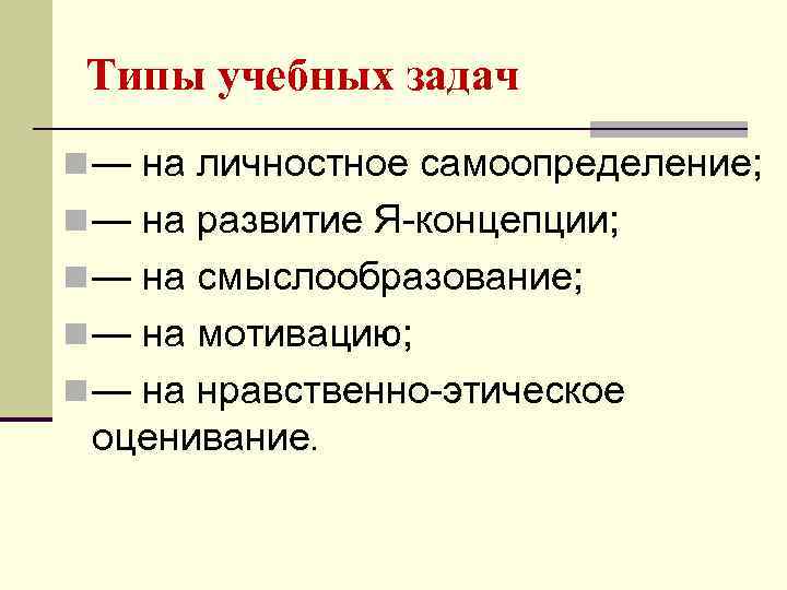 Типы учебных задач n — на личностное самоопределение; n — на развитие Я концепции; n — на смыслообразование; n — на мотивацию; n — на нравственно этическое оценивание.