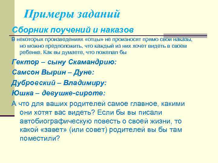 Примеры заданий Сборник поучений и наказов В некоторых произведениях «отцы» не произносят прямо свои наказы, но можно предположить, что каждый из них хочет видеть в своем ребенке. Как вы думаете, что пожелал бы Гектор – сыну Скамандрию: Самсон Вырин – Дуне: Дубровский – Владимиру: Юшка – девушке-сироте: А что для ваших родителей самое главное, какими они хотят вас видеть? Если бы вы писали автобиографическую повесть о своей жизни, то какой «завет» (или совет) родителей вы бы там поместили?