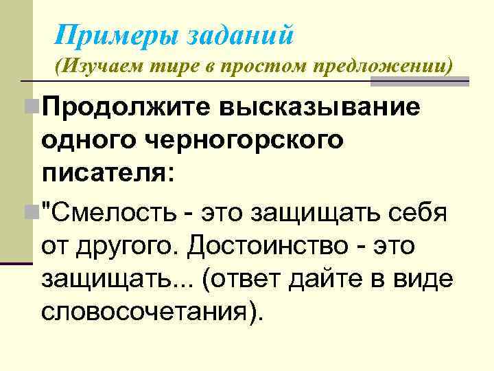 Примеры заданий (Изучаем тире в простом предложении) n. Продолжите высказывание одного черногорского писателя: n"Смелость это защищать себя от другого. Достоинство это защищать. . . (ответ дайте в виде словосочетания).