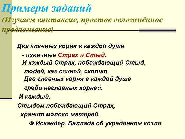 Примеры заданий (Изучаем синтаксис, простое осложнённое предложение) Два главных корня в каждой душе - извечные Страх и Стыд. И каждый Страх, побеждающий Стыд, людей, как свиней, скопит. Два главных корня в каждой душе среди неглавных корней. И каждый, Стыдом побеждающий Страх, хранит молоко матерей. Ф. Искандер. Баллада об украденном козле